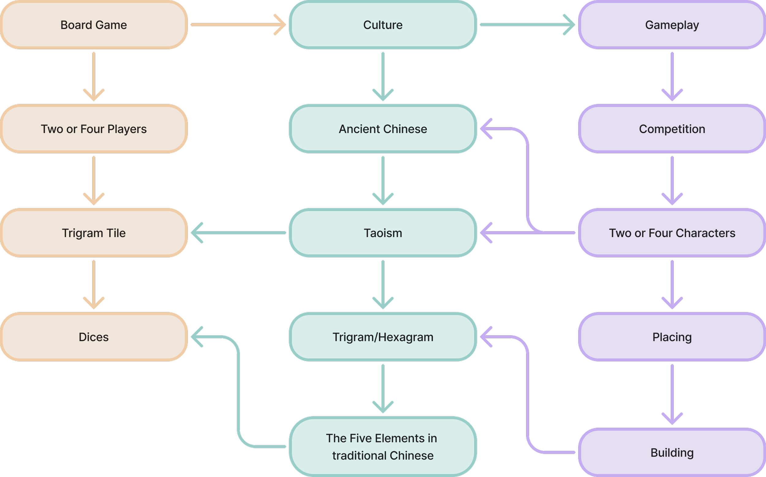 Each trigram also corresponds to one of the Five Elements—Metal, Water, Wood, Fire, or Earth—and there are generative and restraining relationships among the elements. This interconnects all trigrams, making each trigram no longer isolated. These Five Element relationships also illustrate the flow of energy between trigrams, providing abundant creative space for designing game mechanics.