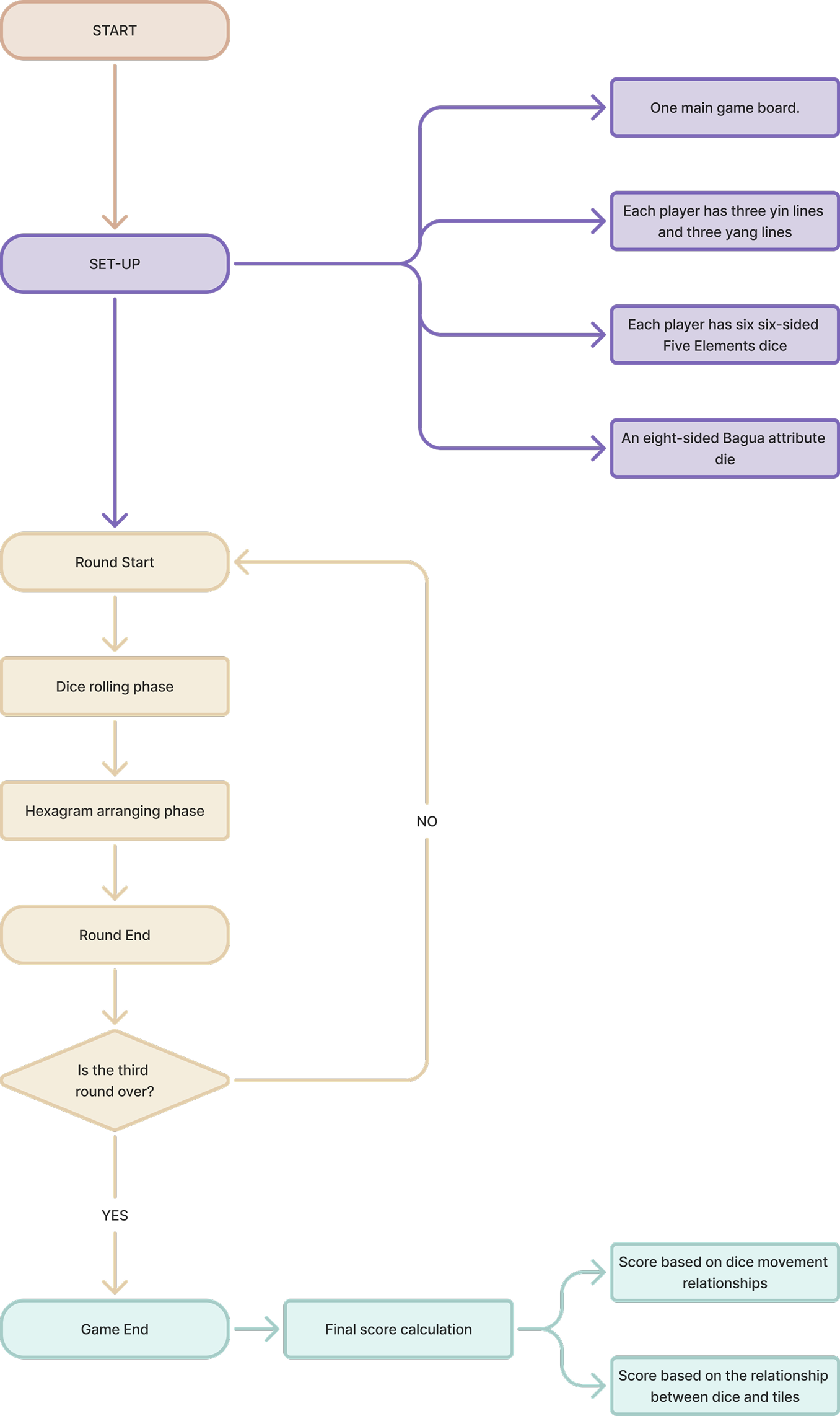 We have separated the generative and restraining relationships of the Five Elements corresponding to the trigrams. Originally, players needed to consider both relationships when placing dice and during final scoring. Now, players only consider restraining relationships when placing dice and generative relationships during final scoring.
