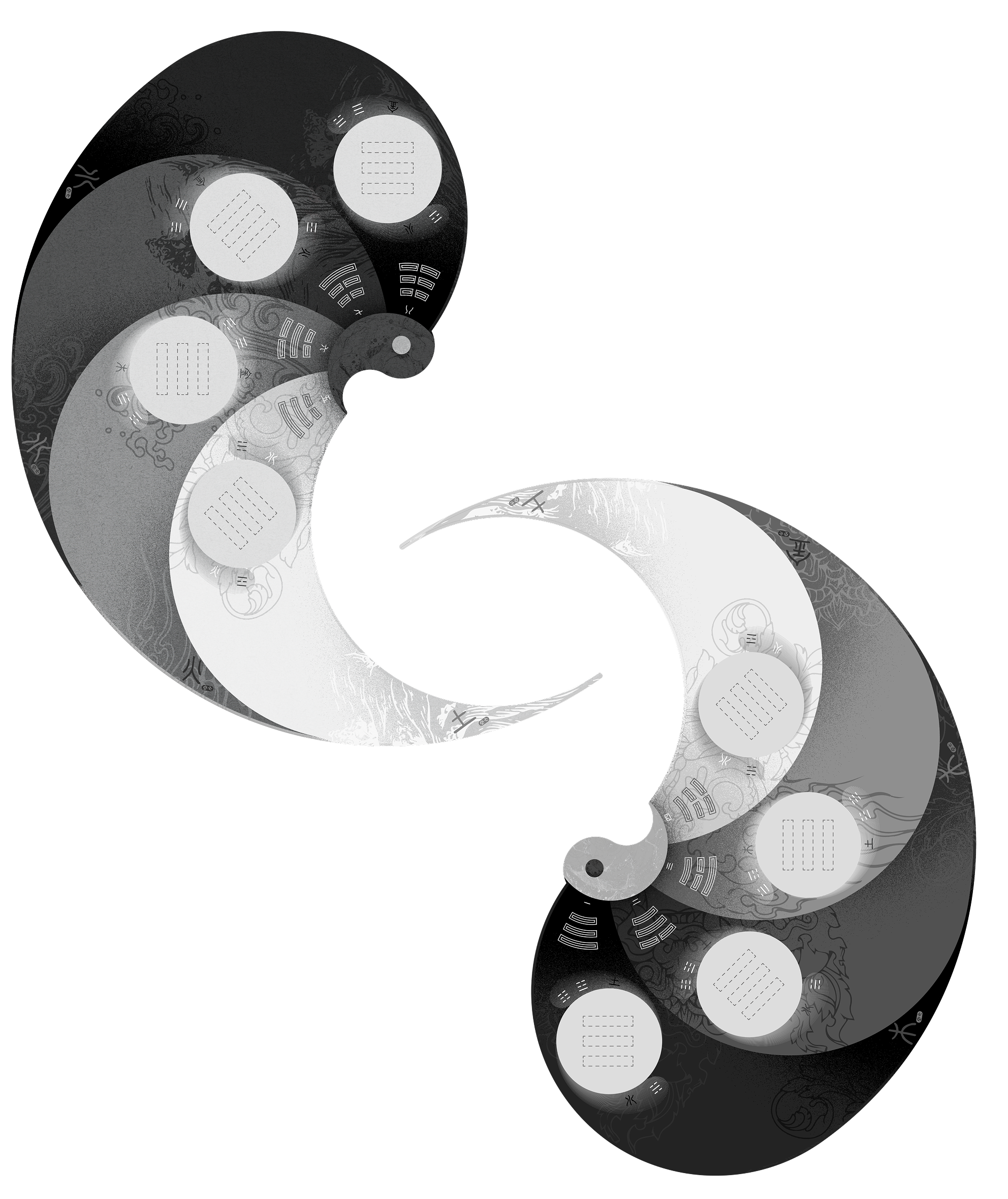 For the second version, I moved away from the color-based approach and adopted a monochromatic palette of black, white, and gray to achieve greater visual harmony. This shift echoed the Bagua’s core philosophy of yin and yang—light and darkness in balance. Instead of color, I used patterns, textures, and motifs to express each element’s qualities, creating a design that felt more refined, culturally resonant, and timeless.