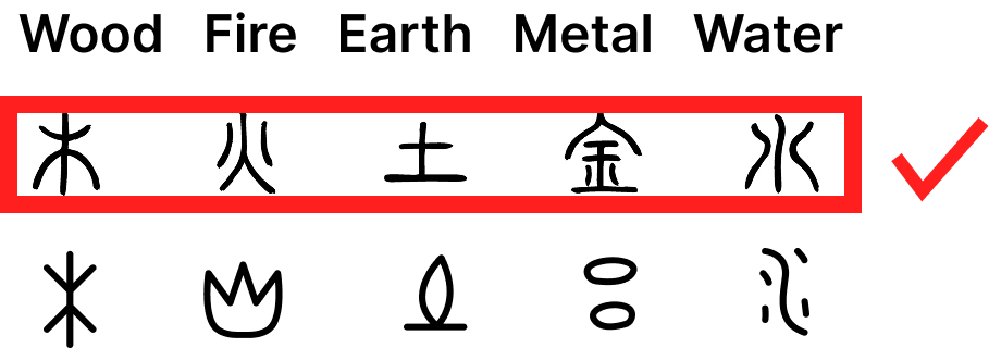 In the symbol design phase, I first used seal script characters to represent Wood, Fire, Earth, Metal, and Water. Later, seeking a more intuitive yet ancient feel, I experimented with Oracle Bone and Bronze Inscription–inspired forms. However, feedback showed these pictographic symbols were harder to interpret. To balance clarity and style, I ultimately returned to using seal script characters to represent the Five Elements.