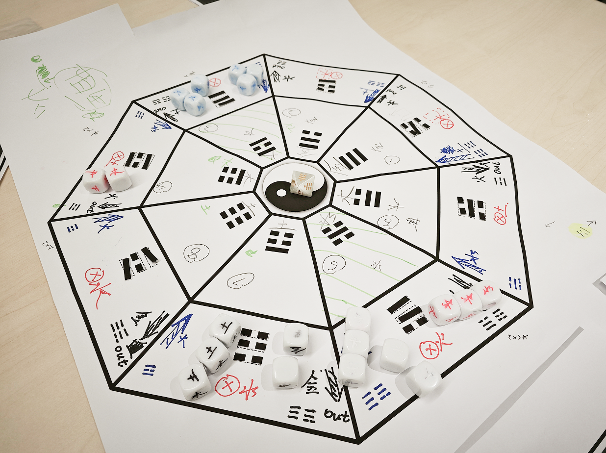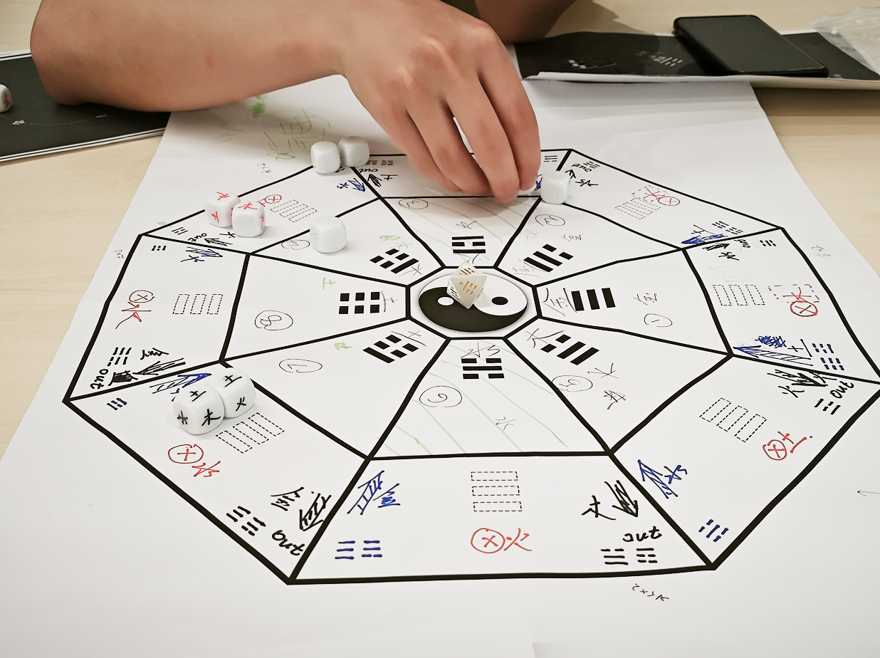 At the same time, players are prevented from placing dice directly in the Earlier Heaven Bagua to avoid confrontation and competition. However, through the energy flow generated by the generative relationships among trigrams, dice can move from the Later Heaven region to the Earlier Heaven region or be pushed off the board, losing points. This encourages players to focus more on building the Later Heaven Bagua.